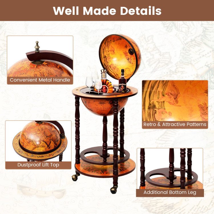 Add elegance and antique stylish to any room with this high quality wine bar. It features a wood construction, and antique stylish wine bar are made of high quality plastic. Handsome turned legs add to the authentic look. Smooth rolling casters that can be moved anywhere quietly and easily. Interior paint is the key of this item to become an artwork. Glass and bottle storage reside among artistically hand-painted interior frescoes reminiscent of domed ceiling, the exclusive work of art boasts secure spots for your treasured bottles and glasses. You will not only enjoy the convenience it brought to you but also the beauty of this wine bar. Its unique outlook will bring highlights to your home and shows your lifestyle.
