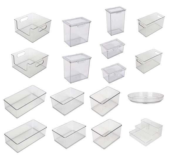 Get organized fast with 17 Piece Pantry Edit, including 17 clear storage pieces. This set comes with pantry canisters, pantry bins, a turntable, a 3-tier riser and more to take on any cluttered space. Mix and match to build custom systems that suit your needs. Use in the pantry, office, playroom, craft space, garage and beyond. The clear components keep contents visible. Designed to stack, modular bins optimize storage. Bring order to any area with this all-in-one organizational kit. Just add style guidance and you're on your way to tidier, stress-free living.