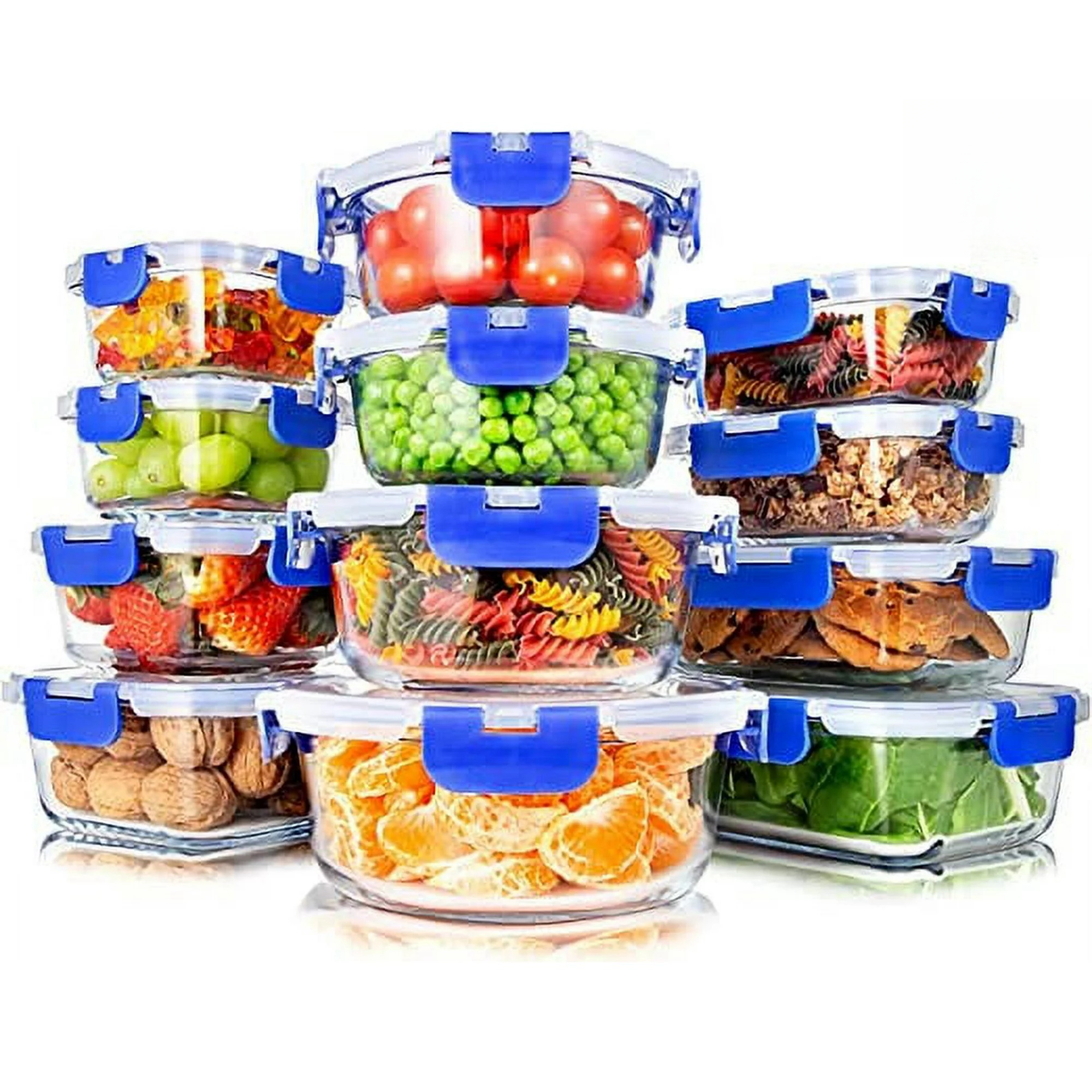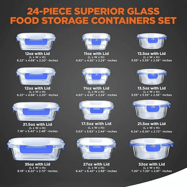 Containers Tolerate Rapid Temperature Changes without Warping or Cracking - Glass Containers won’t Absorb Stains and Smells - Airtight Seal for Food Freshness - Glossy Surface Maintains the Tastiness of Food for Long Term Use - 100% Leak Proof Glass Meal Prep Containers - Great on-the-go & Freezer to Oven Safe Food Containers - 12 Containers with 12 Lids of Various Sizes - Crafted of High Borosilicate Glass - Safe to Transfer from Freezer to Oven in Instants - Containers are Dishwasher Safe - Friendly to the Environment and Free of Chemicals - Easy to Clean and Store - Lids are Crafted of BPA Free Plastic - Newly Innovated Hinged lids Technology - Hinged Locks with Removable Gasket - Oven, Microwave, Freezer Safe - Stain and Odor Resistant - 4 Snap Airtight, Leak-proof Locking Lid.24-PIECE SET: The glass food containers set comes with 24 containers ranging from 11 oz. to 35 oz. capacity with lids for meal prep, food storage, and leftovers. The containers are oven, microwave & freezer-safe. Shapes are rectangle, square, and round.PREMIUM GLASS: This glass meal prep container is crafted of high borosilicate transparent glass & can tolerate rapid temperature changes w/out warping or cracking. Safe to transfer from freezer to oven in an instant & won’t absorb stains or smellSAFE & RELIABLE: Unlike plastic, this food storage glass meal prep bundle is free of chemicals & environment friendly. Hot foods can be placed directly to the containers as no chemicals will leech into the food.AIRTIGHT SEAL: The glass containers for food storage features a 4 snap leak-proof lid that creates an airtight seal for food freshness. Newly locking lid design makes the lid easy to flip open & shut. Great for gym, pool, or work.EASY TO CLEAN AND STORE: The food prep container glass is dishwasher safe, making cleaning a breeze. Containers & lids are stackable and nest inside each other so it doesn't take up much space.