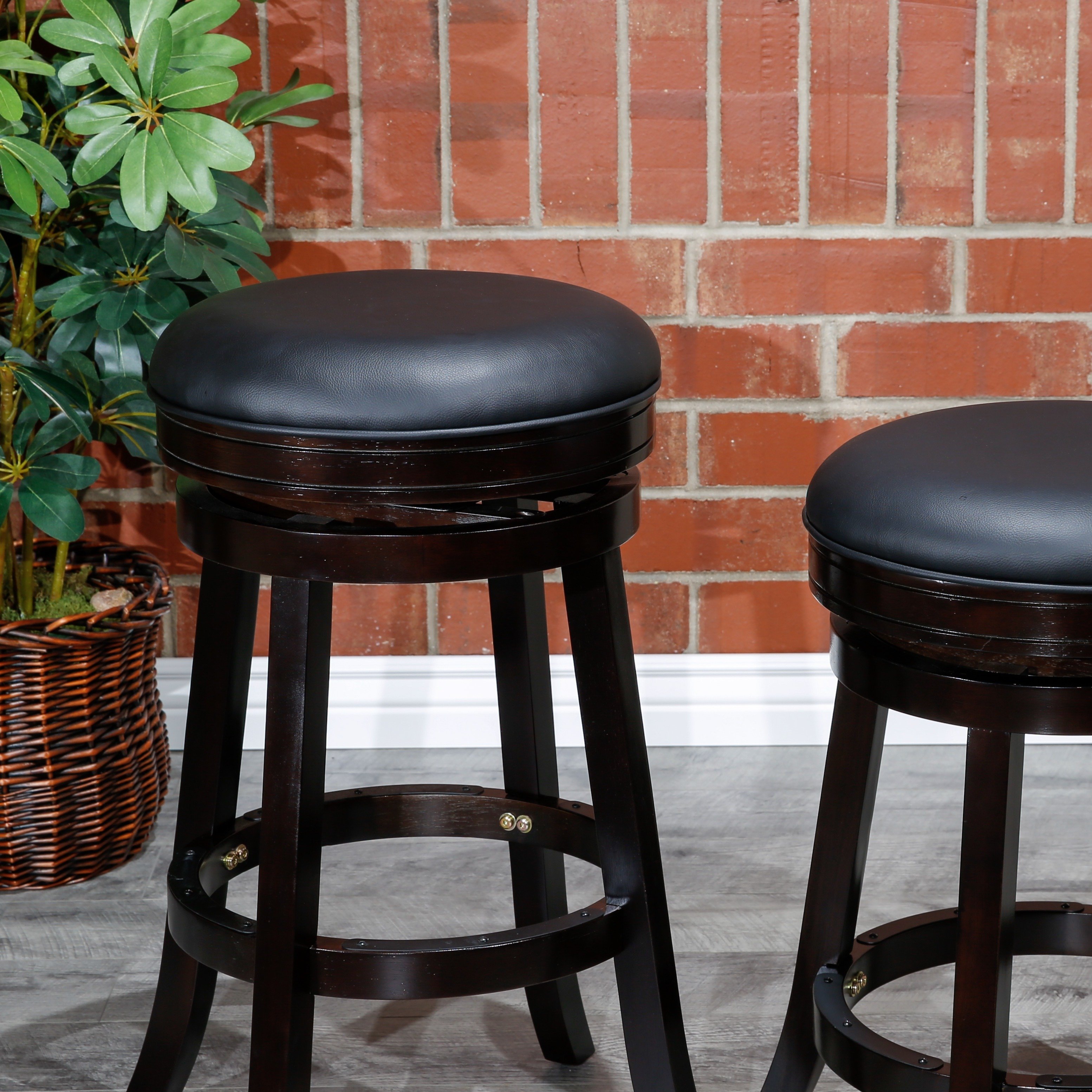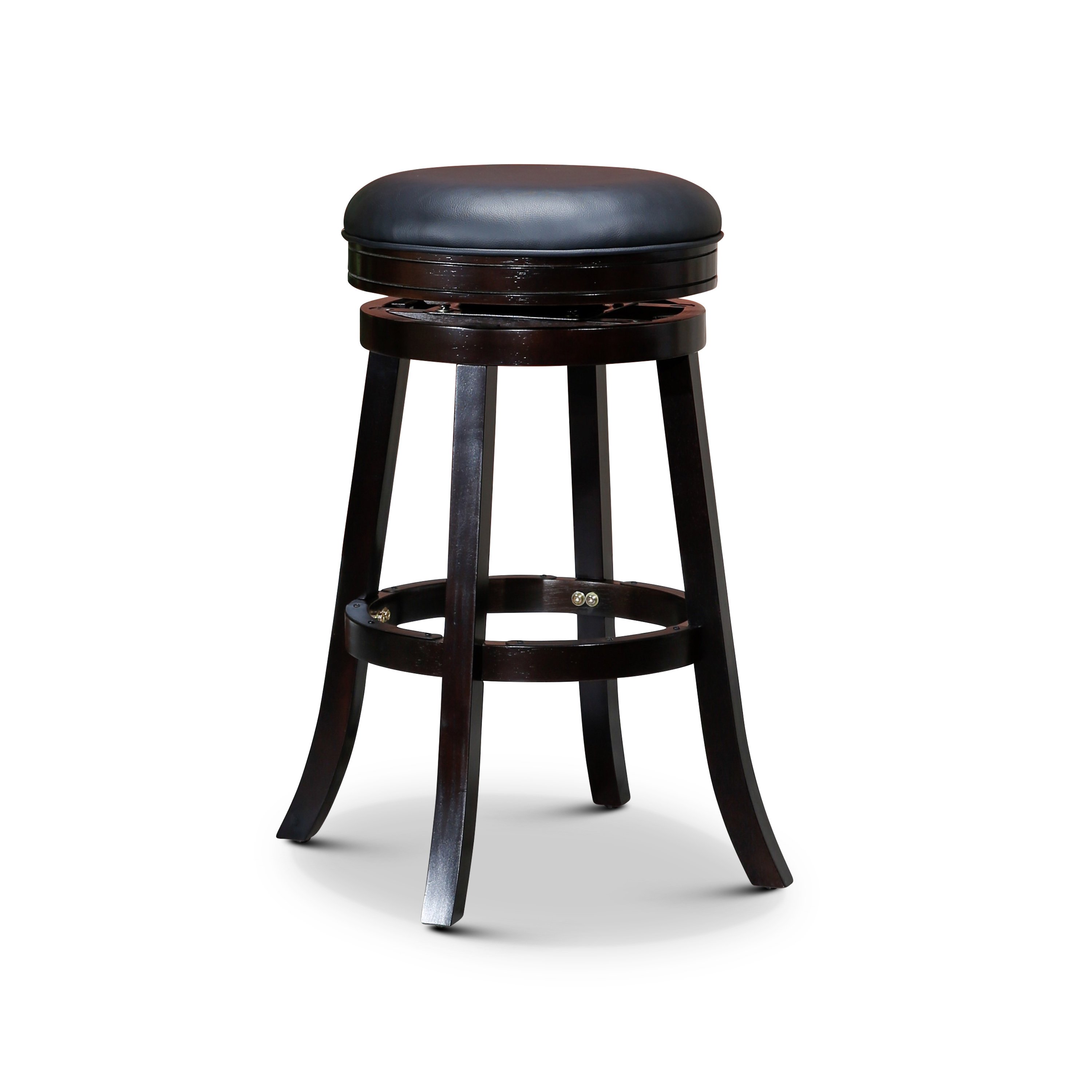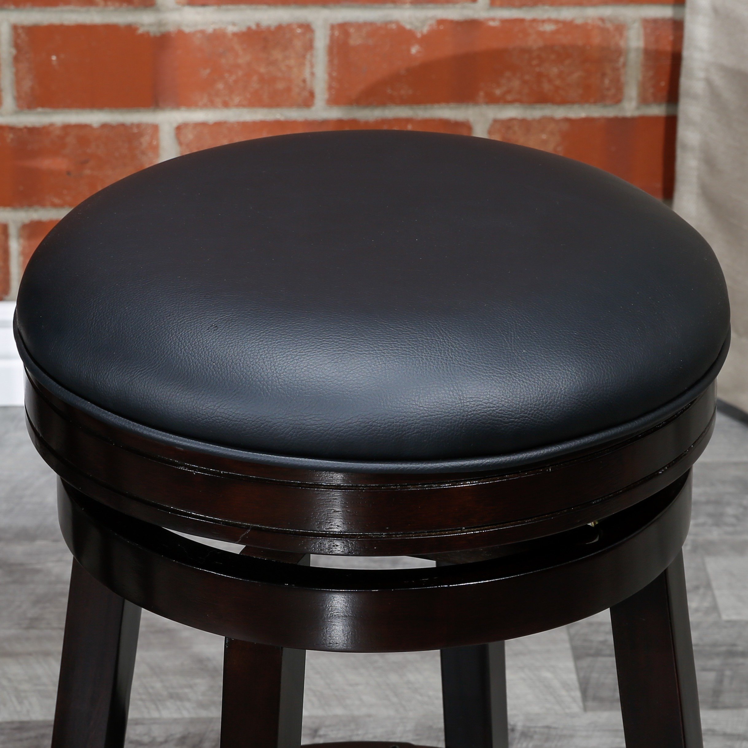 30" Bar Height Backless Swivel Stool, Espresso, Black LeatherCreate a stylish and functional dining or bar space with this backless swivel stool. The classic design and neutral color palette are sure to enhance any décor. The stool is complemented by the padded bonded leather seat and flared leg. These sturdy stools are built with a solid hardwood frame and a round footrest with metal plates to protect the stool from footwear damage. This stool is available in two sizes, four finishes and a variety of bonded leather and fabric colors.