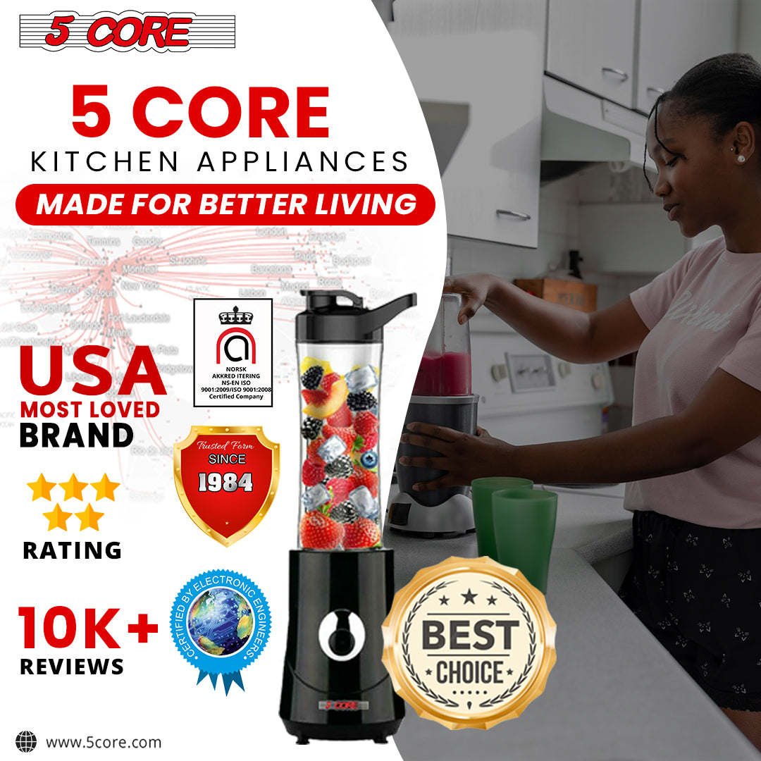 Are you looking for a compact and easy-to-use smoothie maker? Look no further! The 5 Core 160-Watt personal blender is dedicated to efficiency, user-friendliness, and portability. It comes with one bottle, perfectly suited for your busy lifestyle. This high-quality product excels at making daily smoothies, shakes, and morning protein drinks. At 5 Core, Customer satisfaction is our priority—a proven track record of delivering the highest quality product since 1984. |