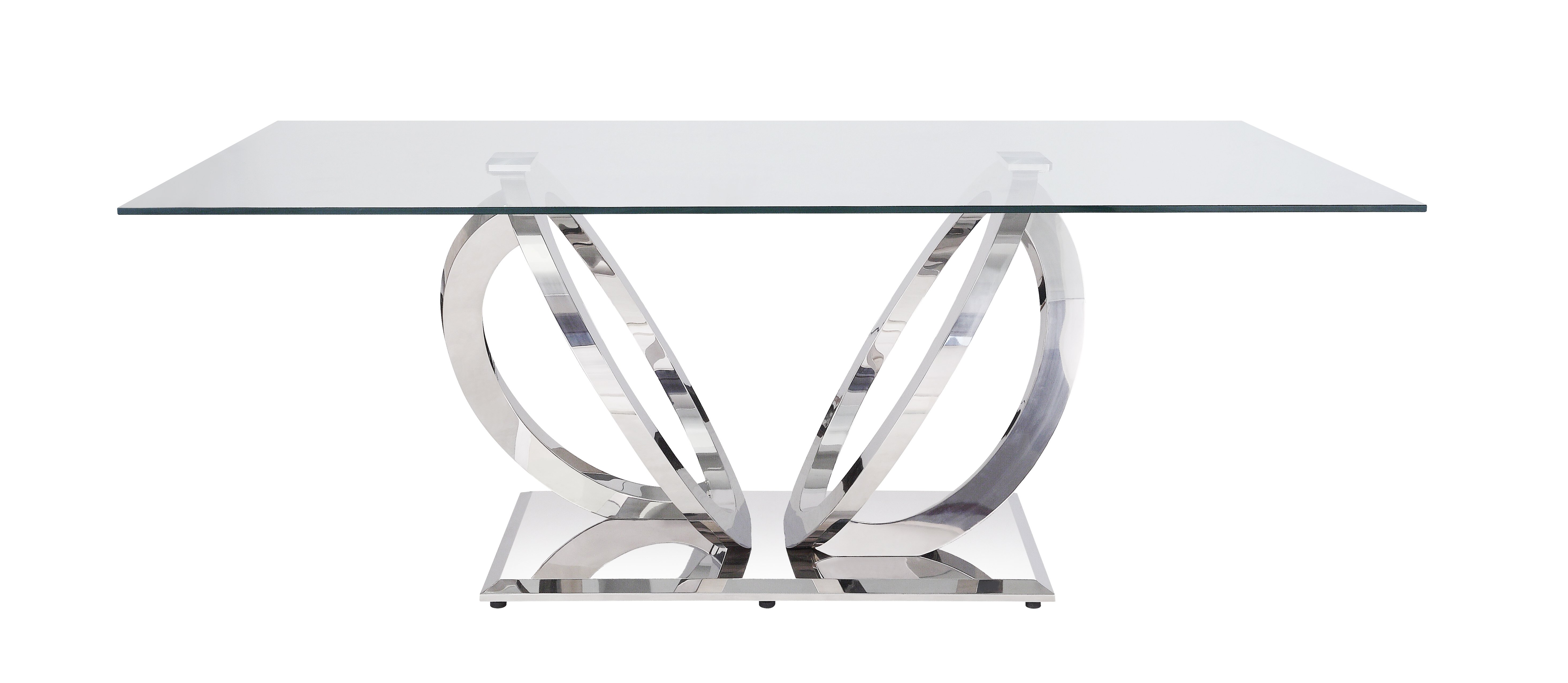 Every perfect party needs a beautiful dining table that complements your dinnerware and home décor. This modern masterpiece can become an alluring focal point for your dining room. The clear glass top allows light to flow right through to the metal base, finished in mirrored silver to reflect modern glamour and shine on your centerpiece and tableware. The stainless steel table base with four interlaced spinning circles supports the glass top, creating unique and interesting visual intrigue. Wow your guests at your next dinner party with the Finley Dining Table.