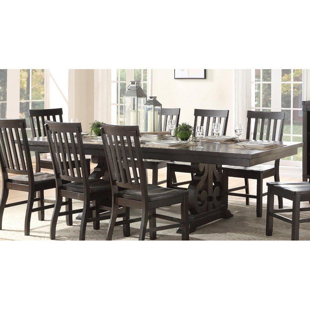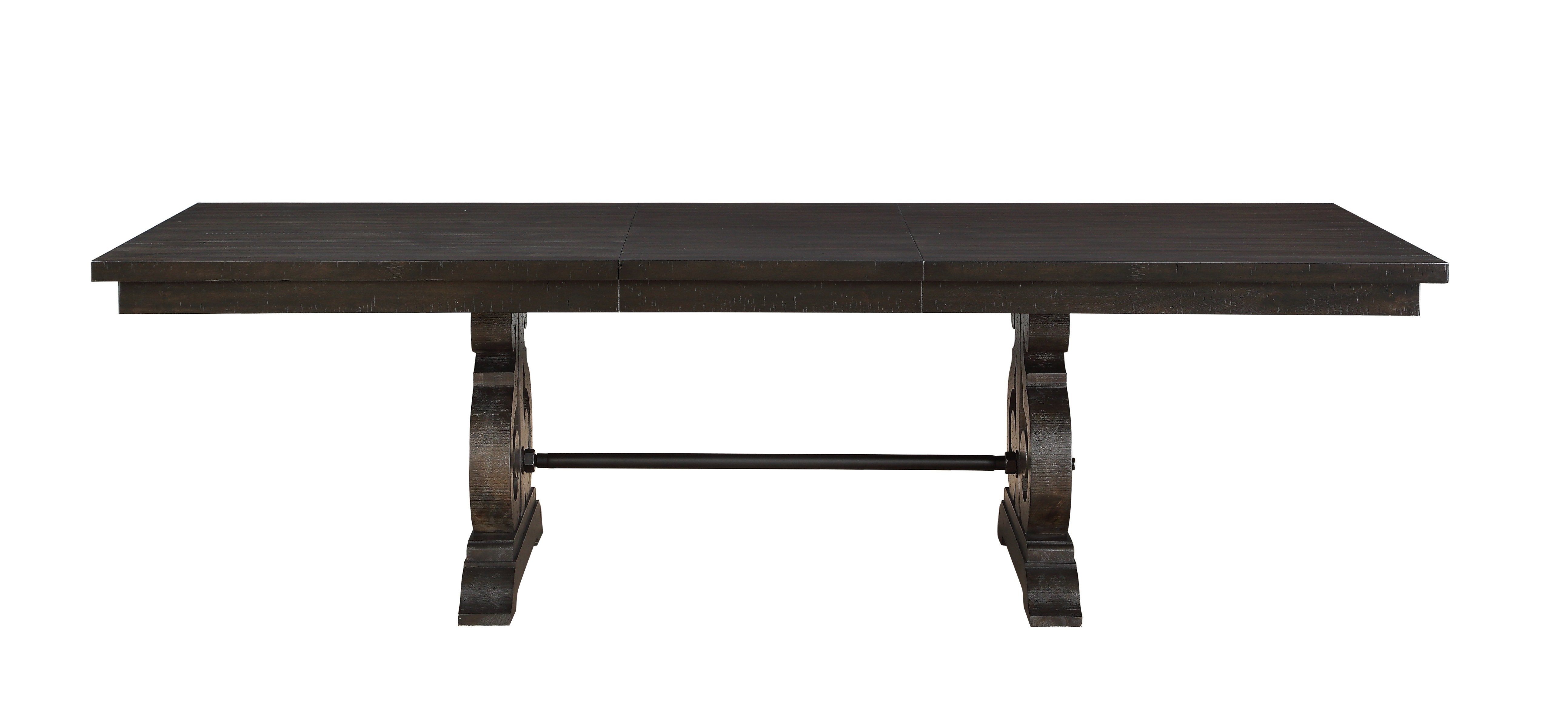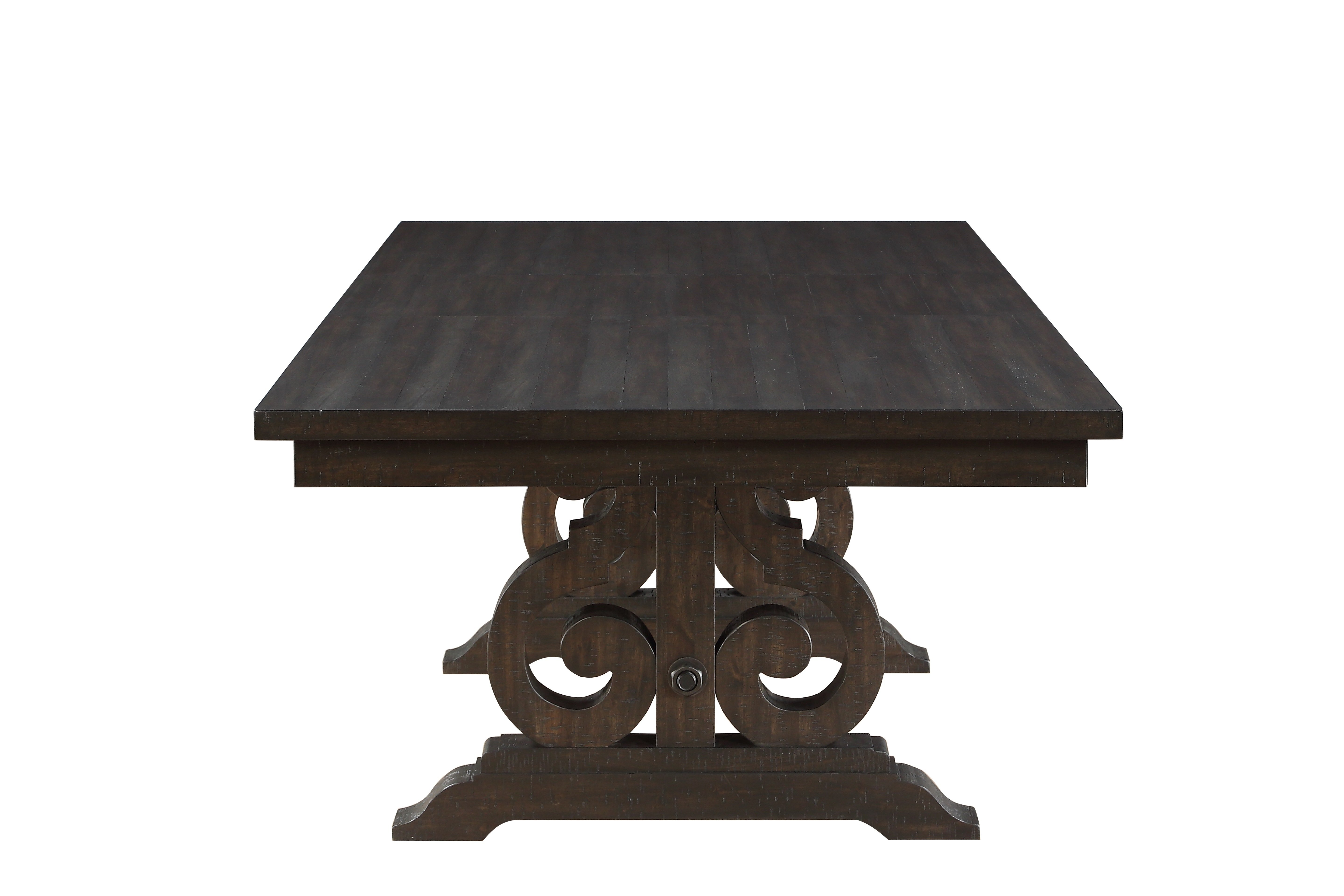 •KD, Rectangular Trestle Table• NO Storage• Extension Top: 1" x 24" Removable Leaf• Wood Top & Base w/Scrolled Motifs• CONSTRUCTION• Wood Top & Apron: Wood, Wood Veneer (Acacia), MDF (37mm Thick)• Wood Trestle Base: Scrolled Motifs, Wood (Acacia Solid Wood) (90 x 90mm Thick)