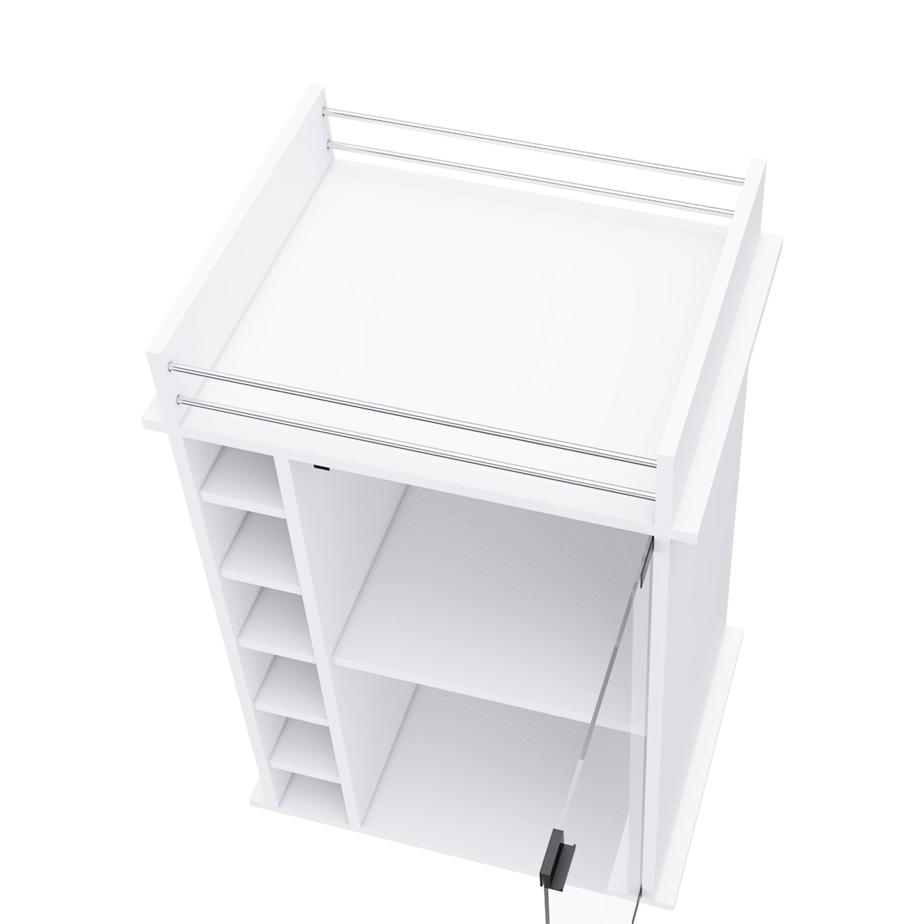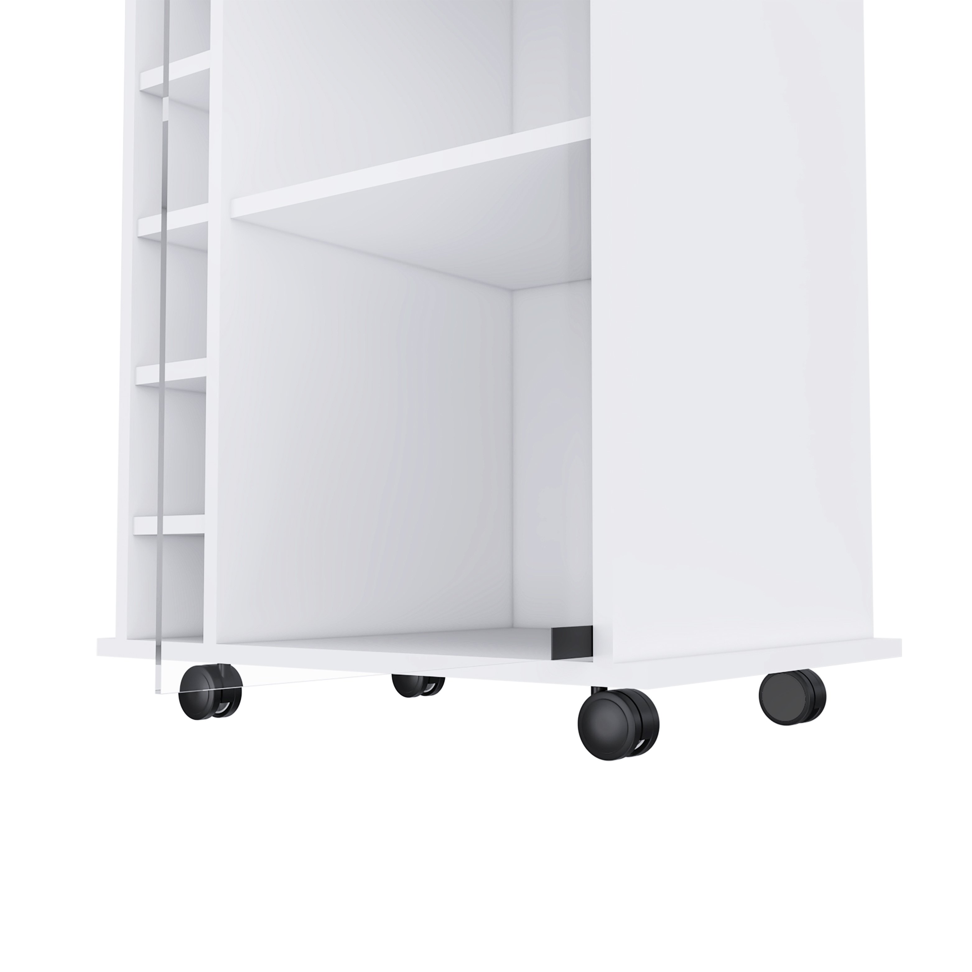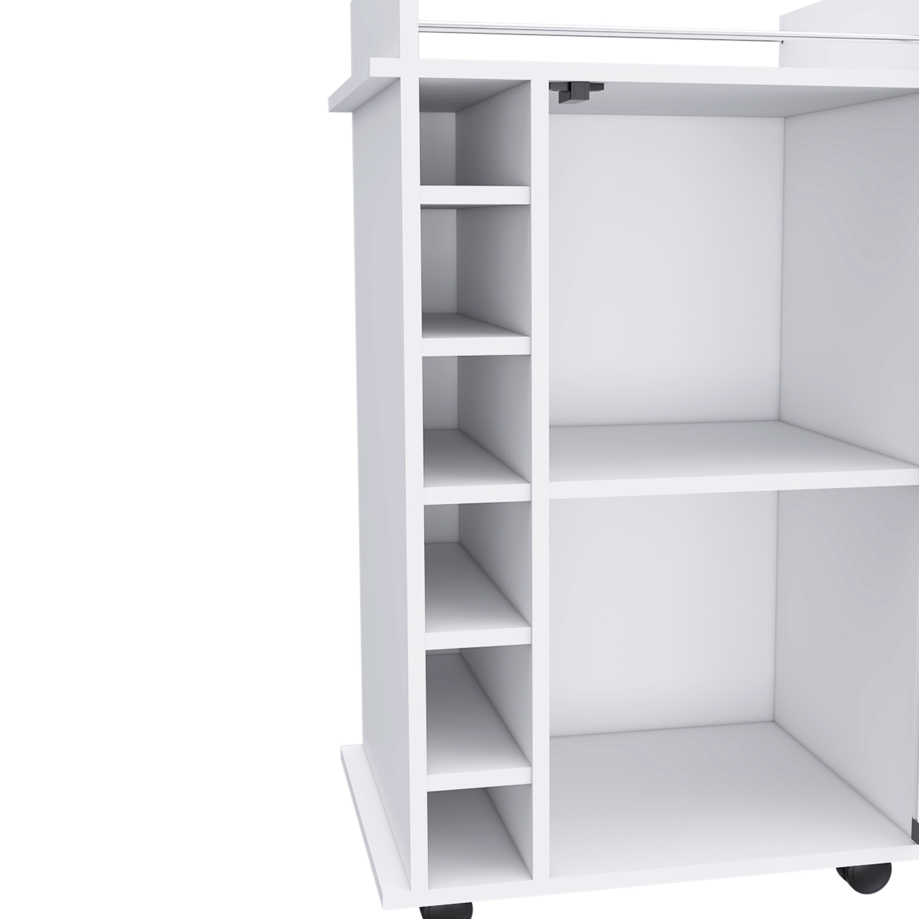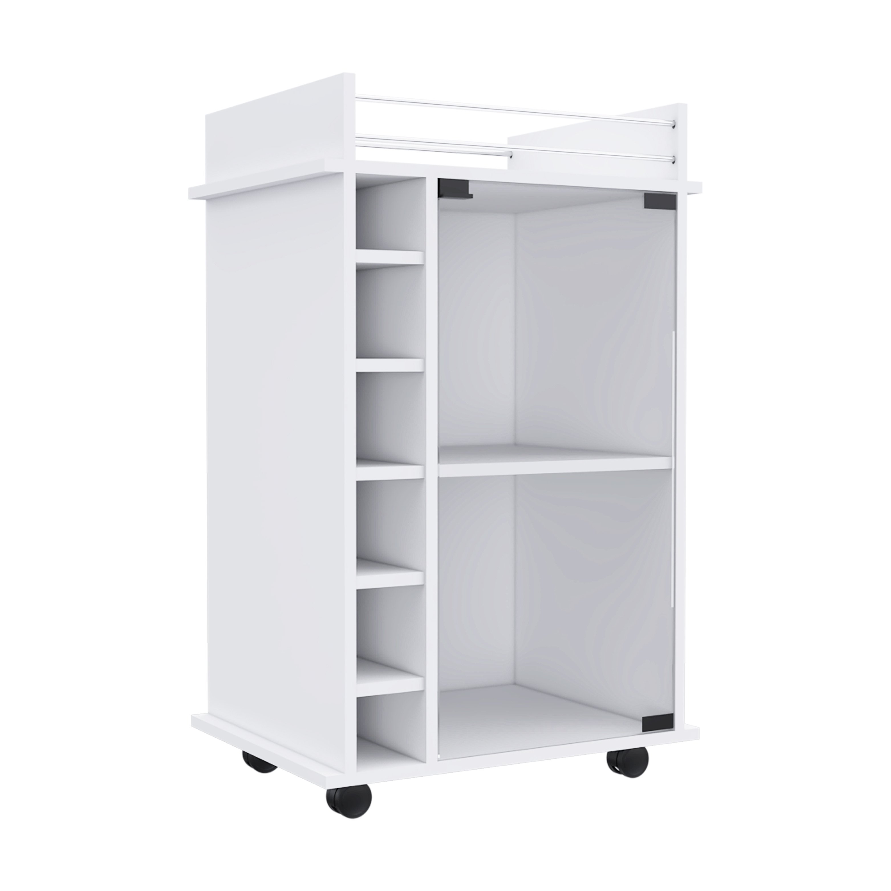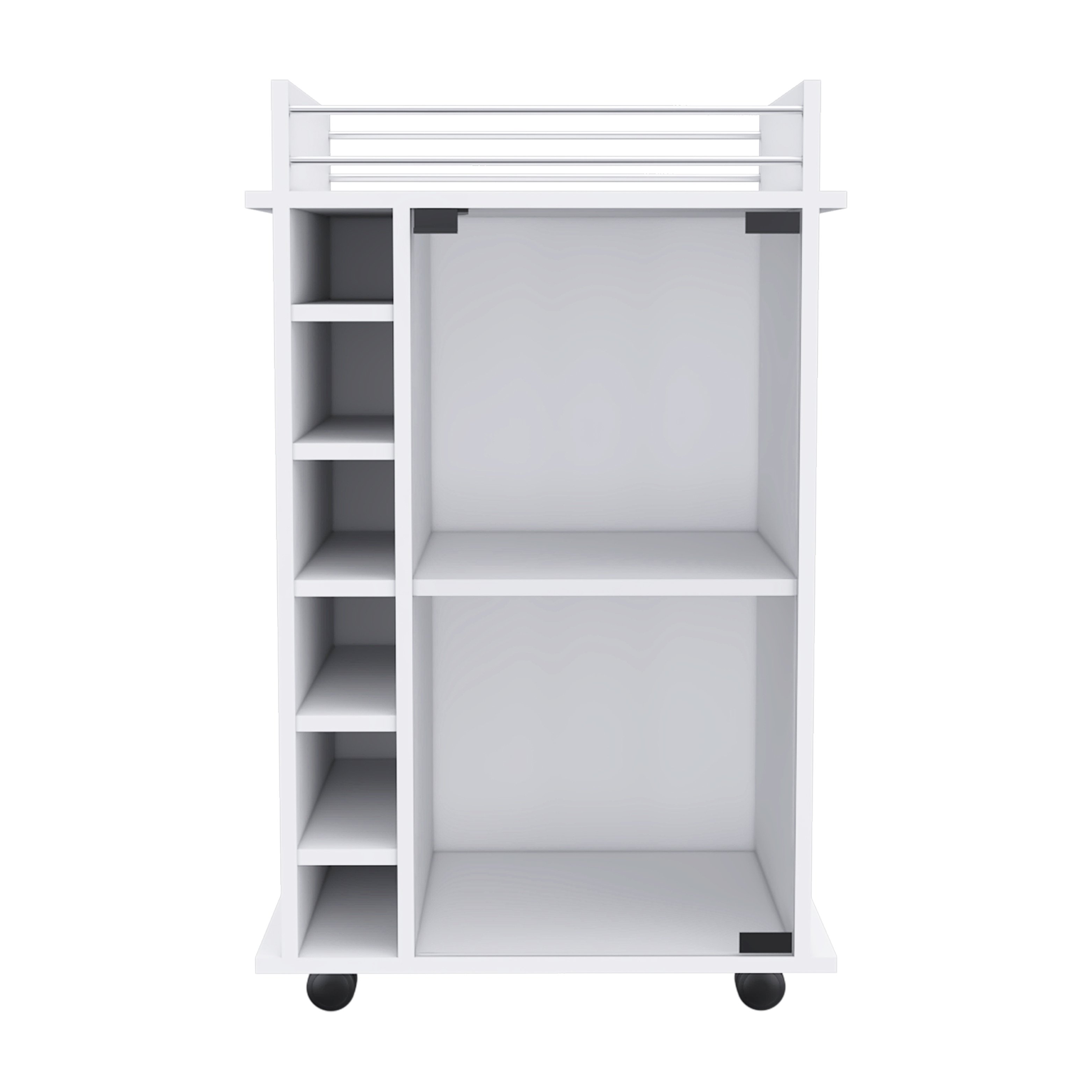 Bar Cart Baltimore, Six Wine Cubbies, Glass Door, Four Caster, Two Shelves, White Finish