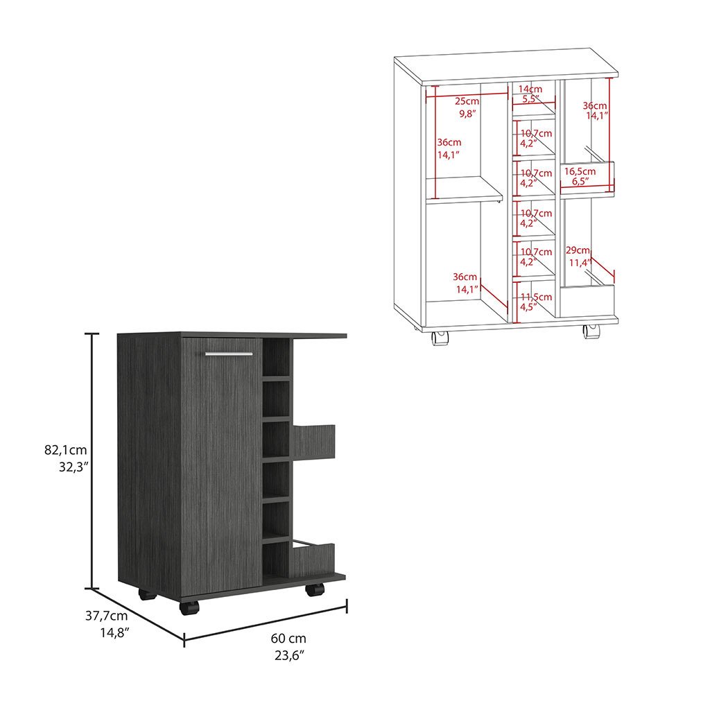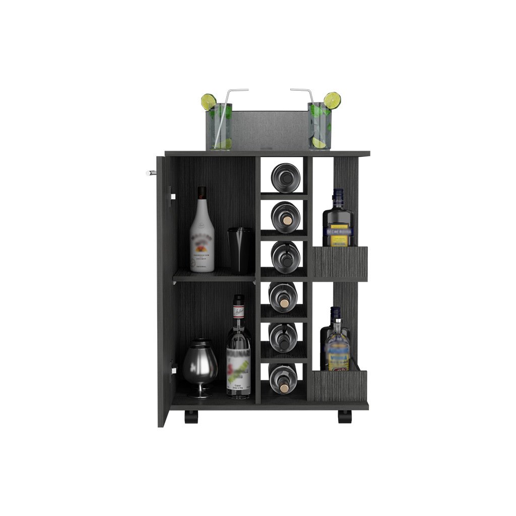 Bar Cart Wells, Four Casters, Six Wine Cubbies, Single Door Cabinet, Smokey Oak Finish