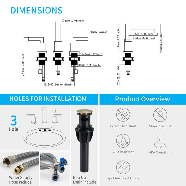 [Easy Installation] The Matte Black bathroom faucet comes with a plastic Pop up Sink Drain Assembly with Overflow and 2 high-density solid braided water supply hoses. All hardware required for installation is included in the package. Detailed installation instructions will guide you on how to perform installation quickly.