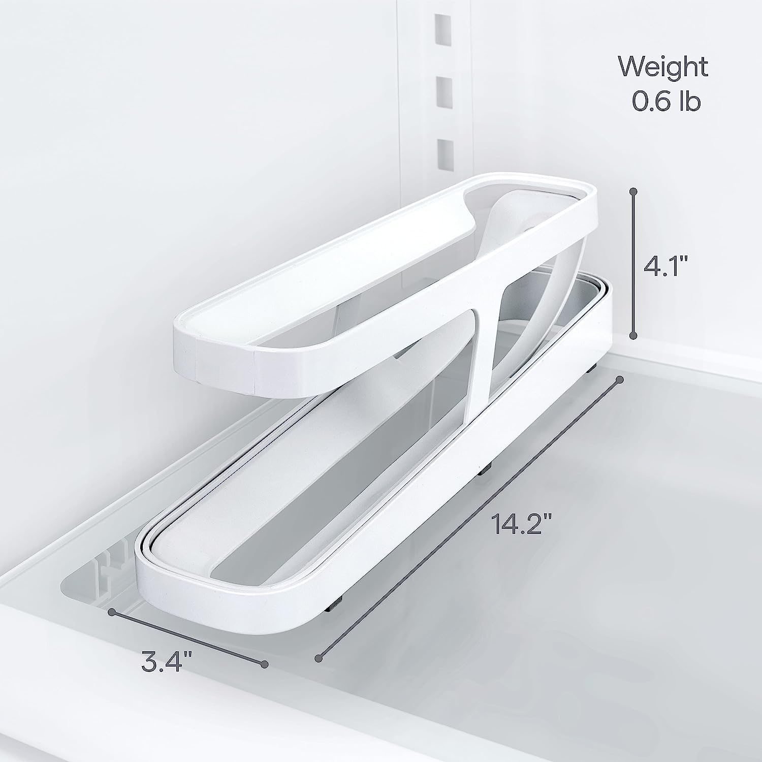 The Egg Dispenser provides a space-friendly solution for storing and using eggs every day. This rolling egg organizer is made to keep 12 to 14 eggs in any size refrigerator. It works for standard, large and jumbo eggs. Simply remove an egg from the front and watch the rest roll forward on a gentle, gravity-fed track. You’ll love ditching the egg carton so you can always see how many eggs are left. A slim, two-tier design frees up fridge storage space (and looks cool too) while non-slip feet hold everything in place. With eggs ready to go, your cooking stays on a roll.