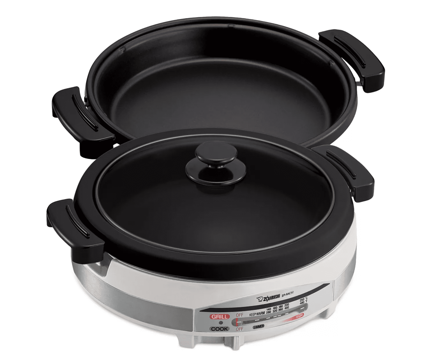The Gourmet d'Expert® Electric Skillet is a multi-functional electric skillet with two cooking plates; a deep pan for soup-type foods like sukiyaki and fondue; and a flat plate for grilling. It also includes a steaming plate for steaming foods.