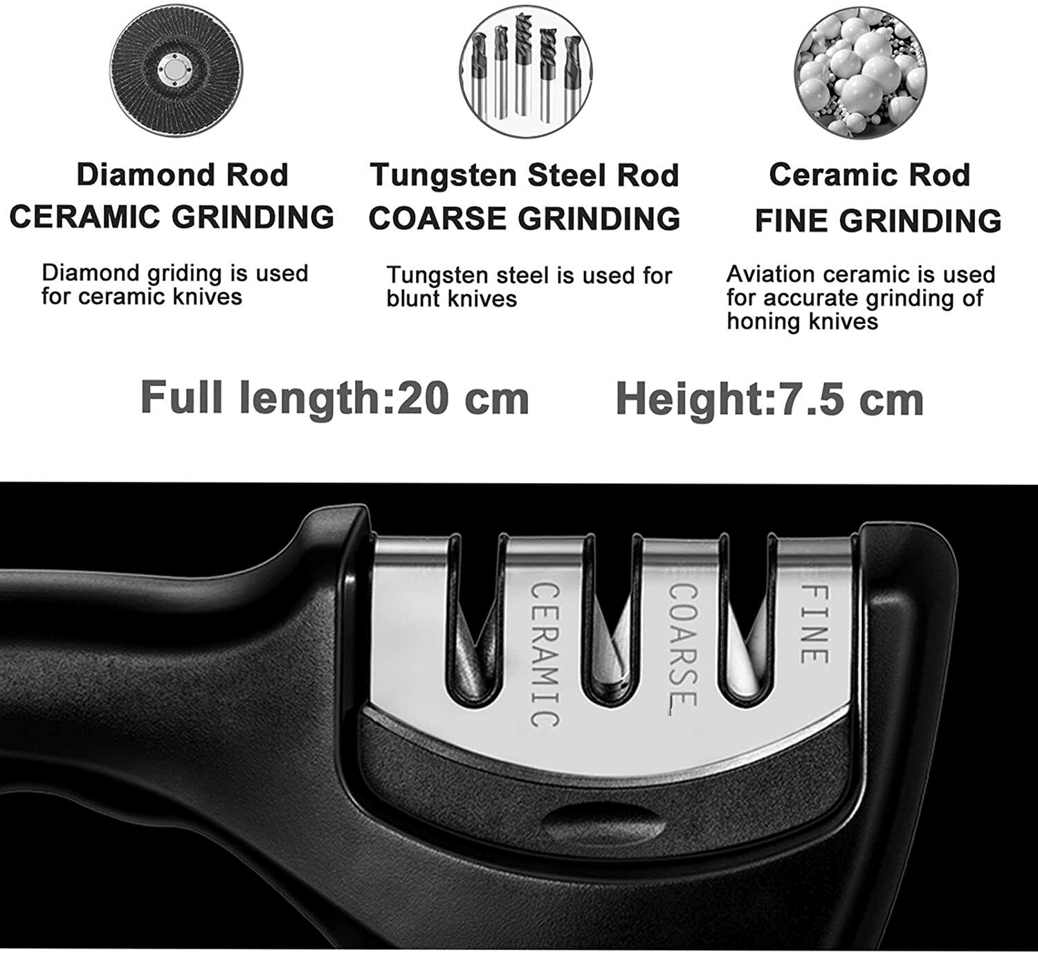 Features The 3-Step Knife Sharpening kits are designed to sharpen any dull or damaged knives and blades. Stage 1: diamond sharpening rod repairs and straightens damaged blades. Stage 2: slot sharpens to restore its V-shape. stage 3 slot fine tunes for a final best polish. How Our Knife Sharpener Works: Stage 1 - Preparation (High grade Diamond rods). This 'roughens' the knife edge to prepare the surface for sharpening. It also smoothes any nicks and imperfections that could cause the blade to 'catch' during the sharpening stage (a common problem with 1 and 2 stage pull through sharpening slots which can cause damage to blades). Stage 2 - Sharpening (Hardened Tungsten Carbide Plates) - Now pull the blade through slot 2's precision angled tungsten carbide plates to create the perfect sharpened 'V' edge on even the bluntest knife. Stage 3 - Hone (Ceramic Stone Rods) - For final edge honing. It removes any burs and gently polishes the blade edges for a super sharp polish.