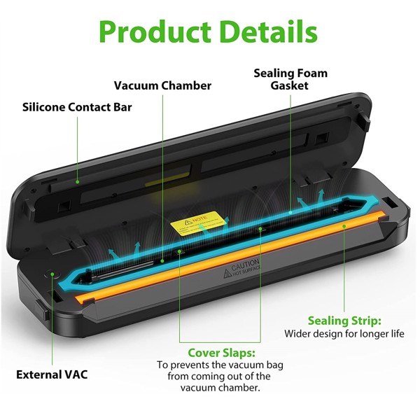 5. Starter Kits - Along with the vacuum sealer and air suction hose, the packaging contains: an extra sealing foam gasket, 5 medium vacuum bags (7.9' x 11.7'), 5 large vacuum bags (11' x 15.7'), both kinds are reusable and waterproof. Vacuum sealer is covered by the KOIOS 1 year warranty.