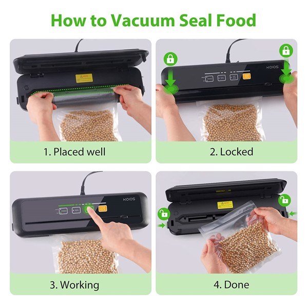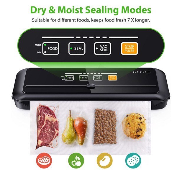1. Dry & Moist Food Modes: KOIOS vacuum sealing system offers you a quick, easy and inexpensive way to preserve your food. Easy one-touch operation allows you to set the right mode when you're sealing dry or moist foods.