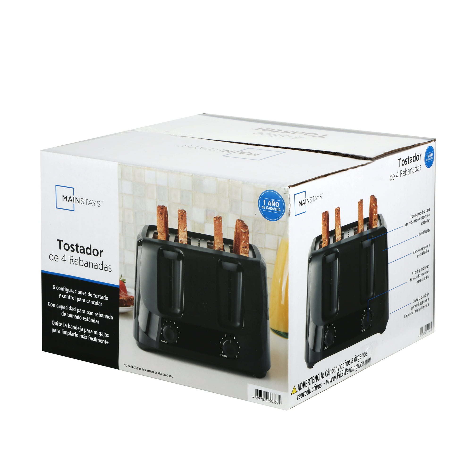Mainstays 4 Slice Toaster Fit bread slices up to 4"x4", toast every time and it will not emit bad smell when toasting; Black Plastic finish: Looks great in any kitchens; Anti slip feet Dimension: 10.4in. L x 10.0 in. W x 14.3 in. H / 263 x 255 x 364mm Auto-centering guides 1-6 shading control & Cancel function: Choose from 6 toast shades or cancel toasting at any time with integrated knob. Removable crumb tray: The crumb tray of the wide slots toaster is easily to slides out which make cleaning easily. Cord Wrap: With a convenient cord storage at the bottom of the toaster. Safe & Health Toaster: Our 4 slice toaster (TA5018) provides both Anti-overheat protection and anti-leakage protection, greatly increasing security when making breakfast. It is absolutely safety for your families' healthy and bring new experience in your daily day.