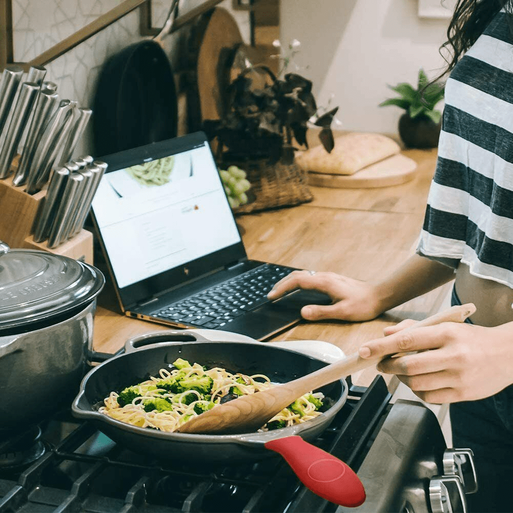 Works with a variety of long cookware handles including most cast iron skillets; sleek alternative to traditional pot holders and oven mitts