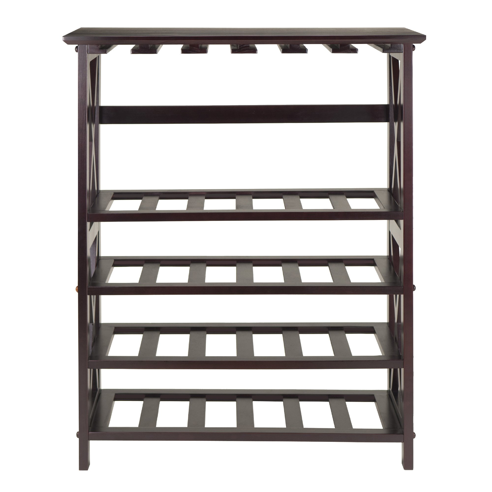 Rio wine Rack and Bar adds dining space and storage to your kitchen or dining room. This sturdy win rack able to accommodate up to 24 bottles and wine glasses. The simple style blends with X legs is great for kitchen or game room. Measures 28.74"W x 13.39"D x 35.67"H in Espresso Finish. Made from combination of solid and composite wood. Assembly Required.Overall size is 28.74"W x 13.39"D x 35.67"H. Top can use as serving station.Glass Rack holds up to 24 Champagne Glasses. Wine Rack holds 24 bottles with 5.31" shelf clearance.Made from combination of solid and composite wood in espresso finish. Assembly Required.nullnullnull This product meets the oversized requirement per UPS/FedEx. The shipping weight reflected is the dimensional weight. This product also meets the large package requirement per UPS/FedEx. The estimated shipping cost will include this fee. Large package is $70.00; applied when length plus girth [(2 x width) + (2 x height)] combined exceeds 130 inches. Additional Handling charge of $10.50 applied where a package's longest side exceeds 48 inches in length; the second longest side exceeds 30 inches in length; or total weight is greater than 70 lbs.This product meets the oversized requirement per UPS/FedEx. The shipping weight reflected is the dimensional weight. This product also meets the large package requirement per UPS/FedEx. The estimated shipping cost will include this fee. Large package is $70.00; applied when length plus girth [(2 x width) + (2 x height)] combined exceeds 130 inches. Additional Handling charge of $10.50 applied where a package's longest side exceeds 48 inches in length; the second longest side exceeds 30 inches in length; or total weight is greater than 70 lbs.