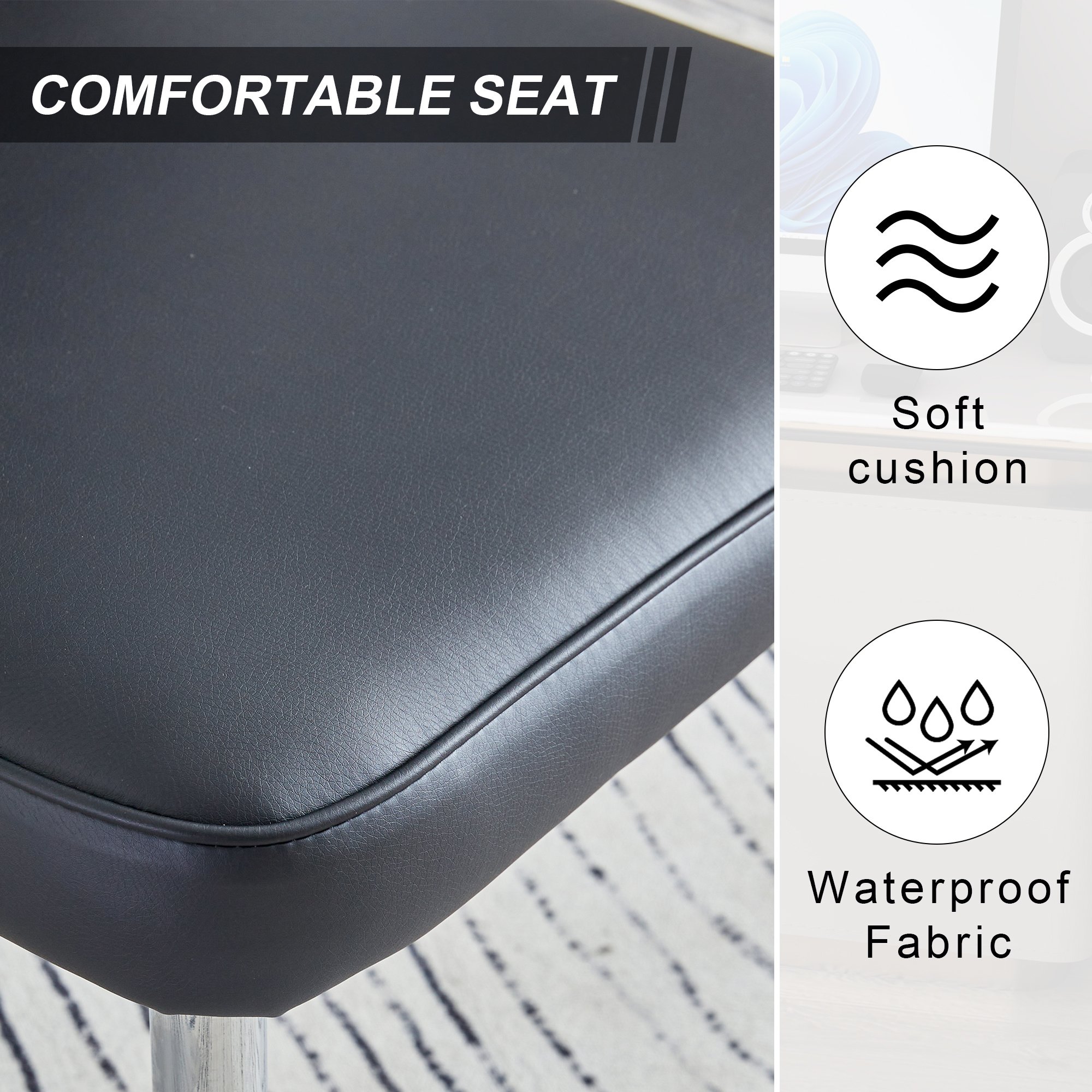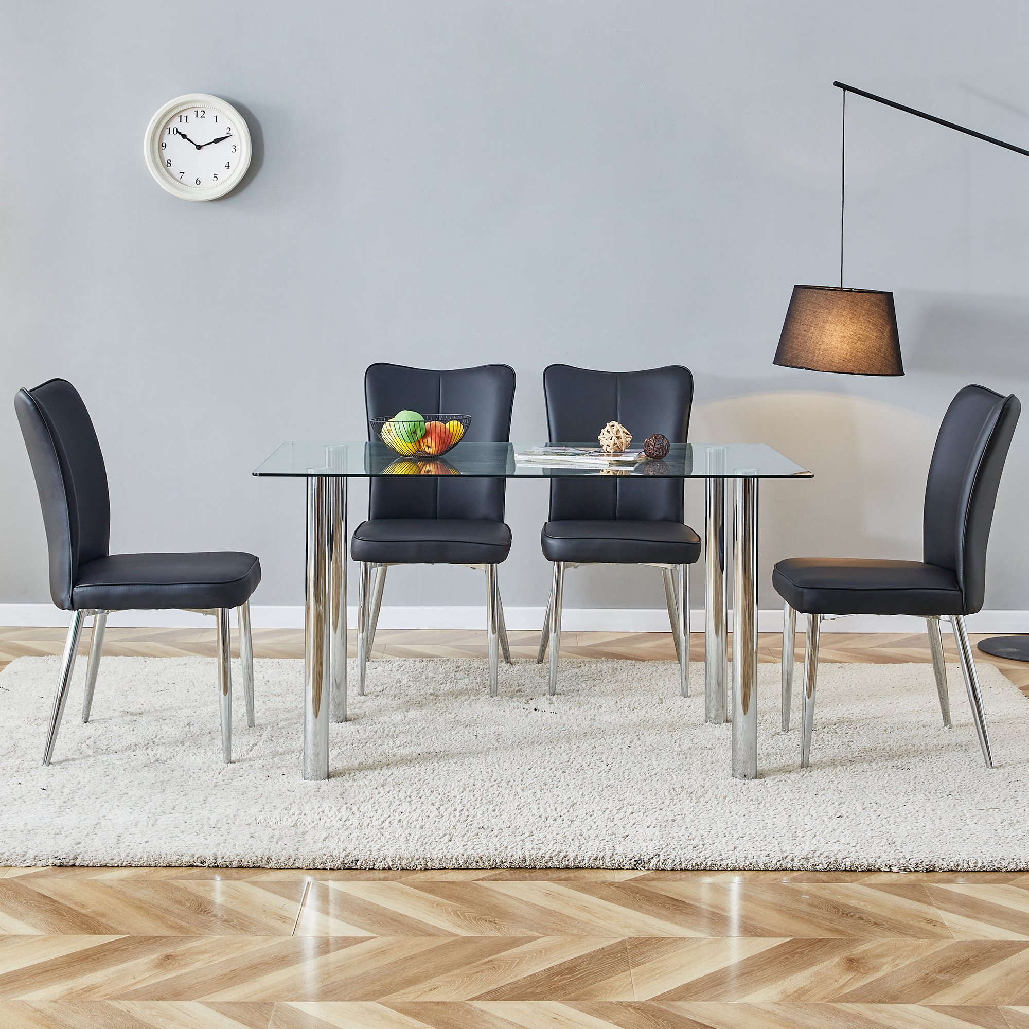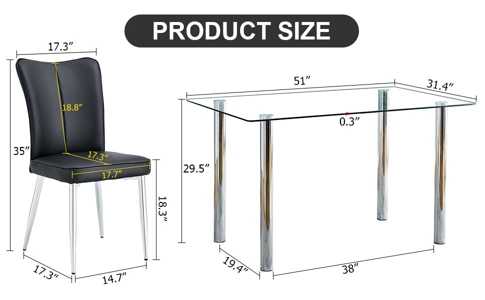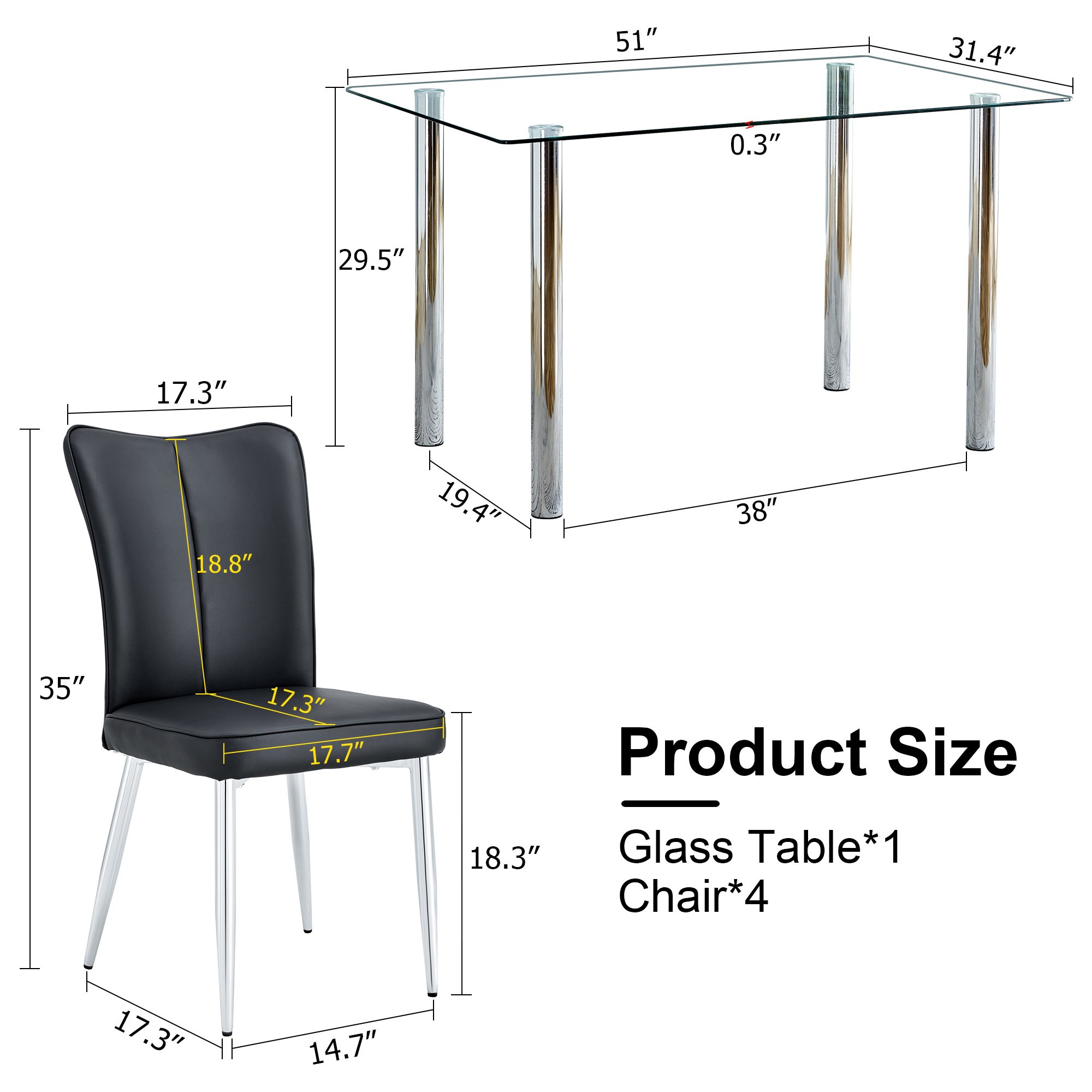 Table and chair set. 1 table and 4 black chairs. The thickness of the glass dining table top is 0.3 feet, with silver metal legs. Black PU leather backrest and seat cushion, electroplated metal chair