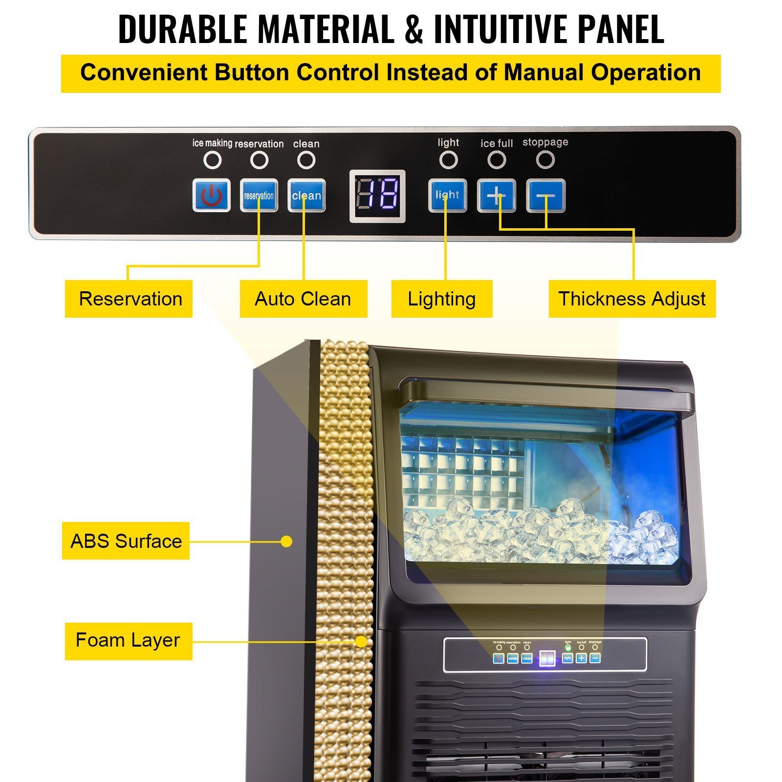 The feature-rich control panel integrates various functions. You can make the ice cubes thicker or thinner and start one-click cleaning simply by pressing the time-setting buttons. Other indicators are also integrated on the panel, such as auto refrigeration, ice-making reservation, full ice stop, etc.