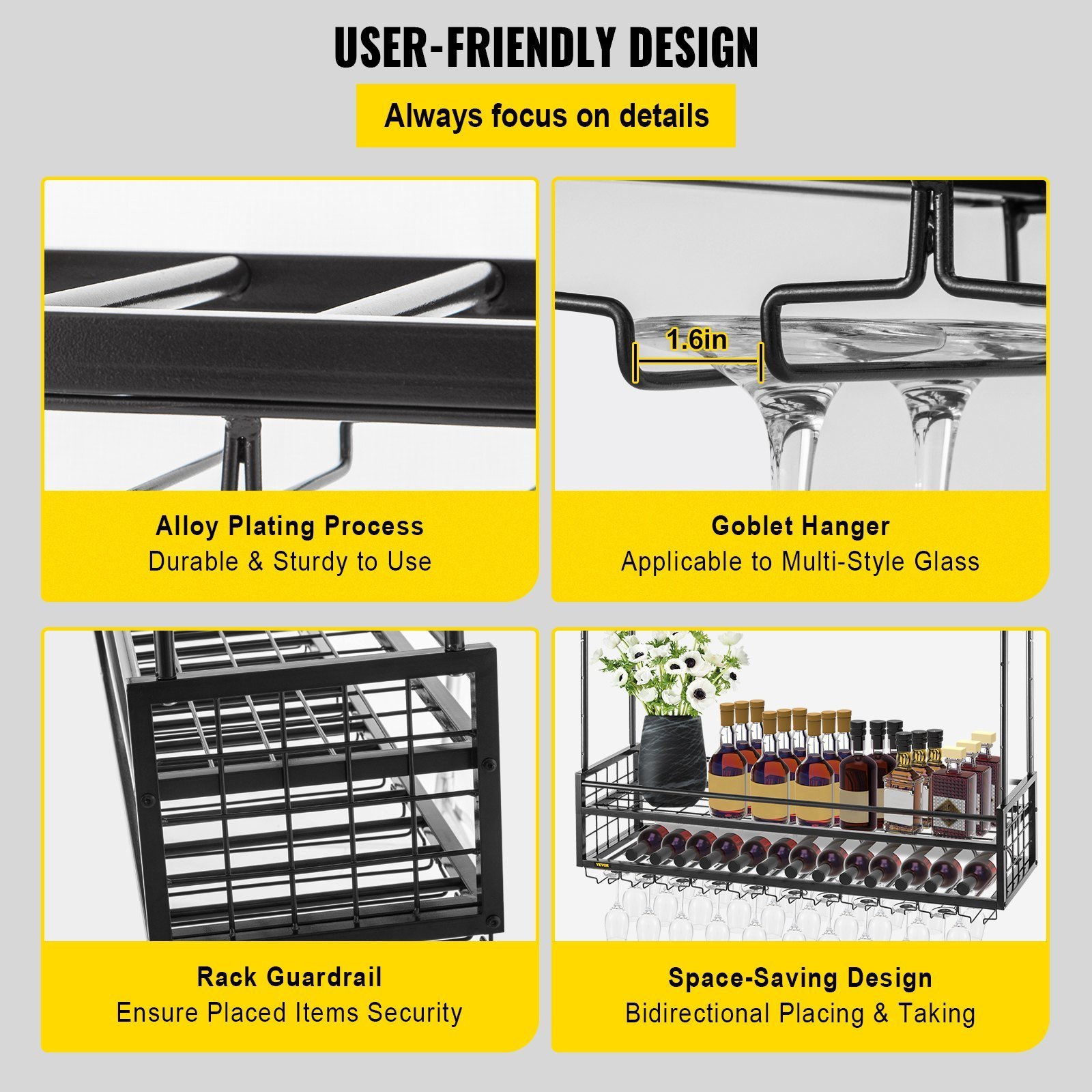 Our ceiling wine glass rack adopts an alloy plating process for durable and sturdy use. The security guardrail is equipped for keeping the wine bottles steadily placed on the rack. And the ceiling-mounted design with upside-down goblets is convenient for putting and taking bottles and glasses in the front and rear directions.