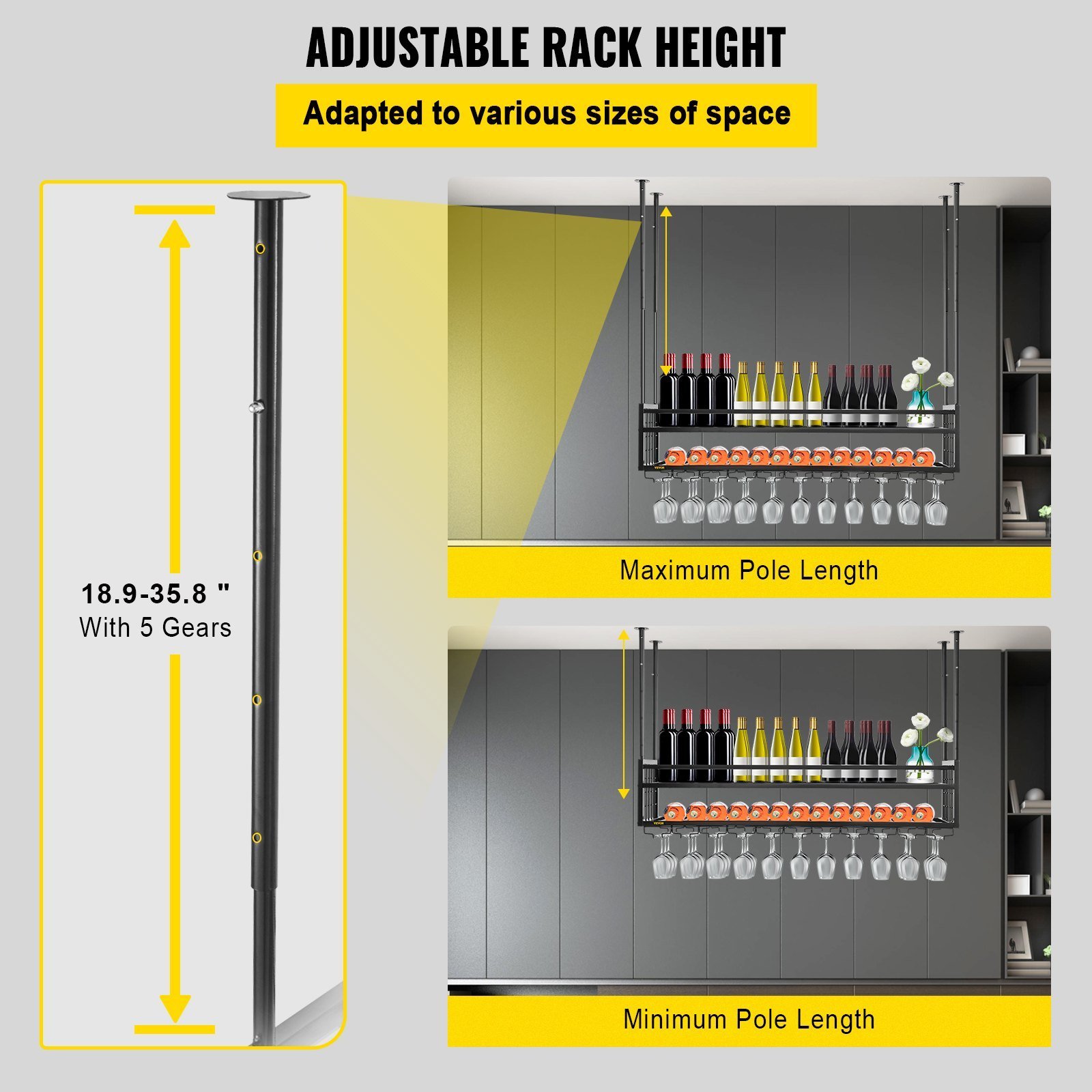 2.Adjustable Poles: The four poles of our hanging wine glass rack are adjustable in height. The height of this rack can be changed from 18.9 to 35.8 inches with 5 gears, allowing you to make this rack fit your installing space.