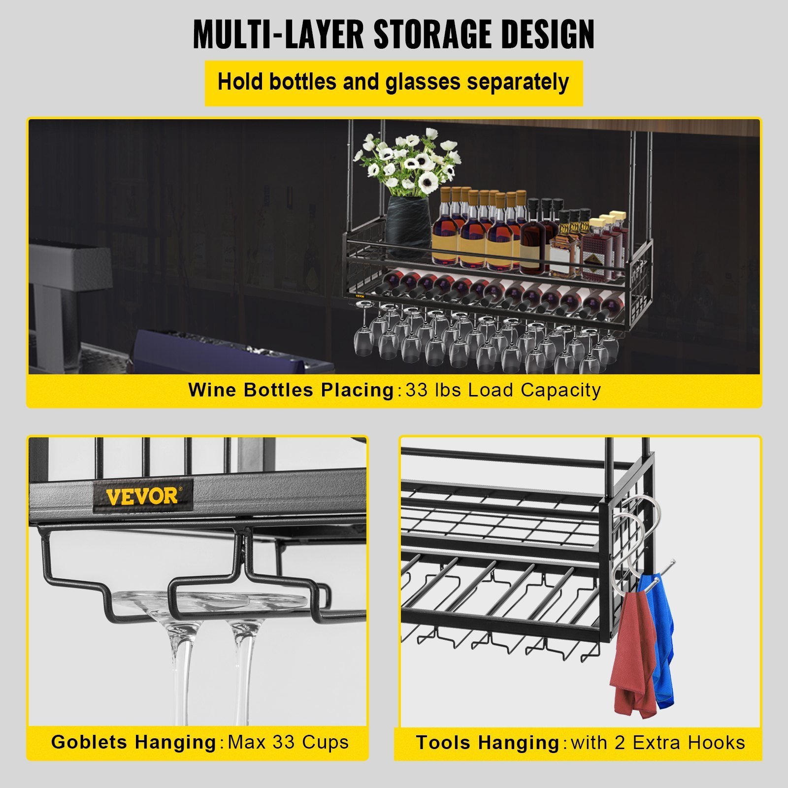 This multifunctional wine bottle rack can be used to hang up to 33 glasses on the bottom of the rack and store wines on the upper shelf. The heavy-duty rack can hold a maximum of 33 pounds of items. Besides, the 2 hooks as gifts are suitable for hanging tools like cleaning cloths or bottle openers.