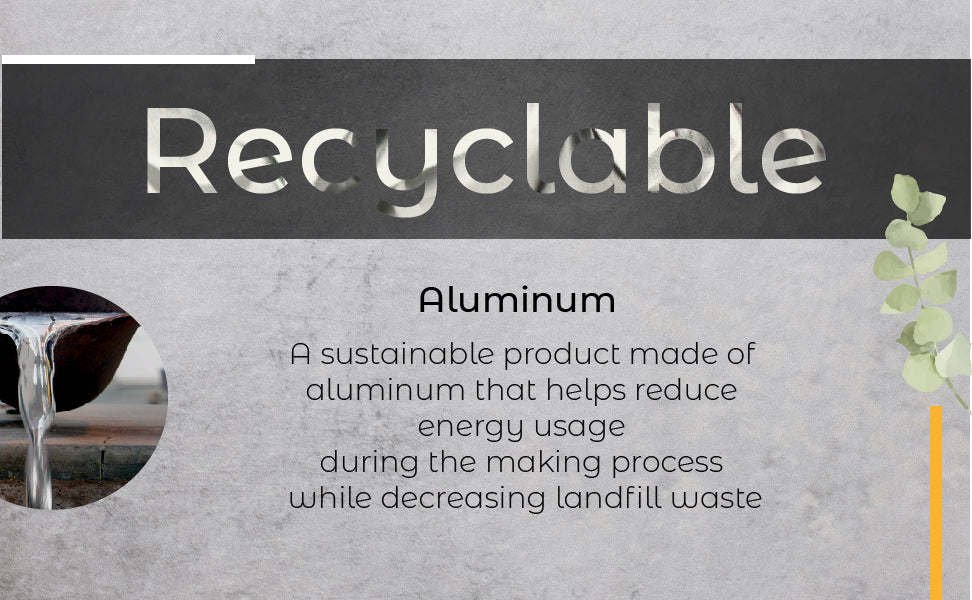 ECO-FRIENDLY. A sustainable product made of recycled aluminum that helps reduce energy usage during the making process while eliminating landfill waste.